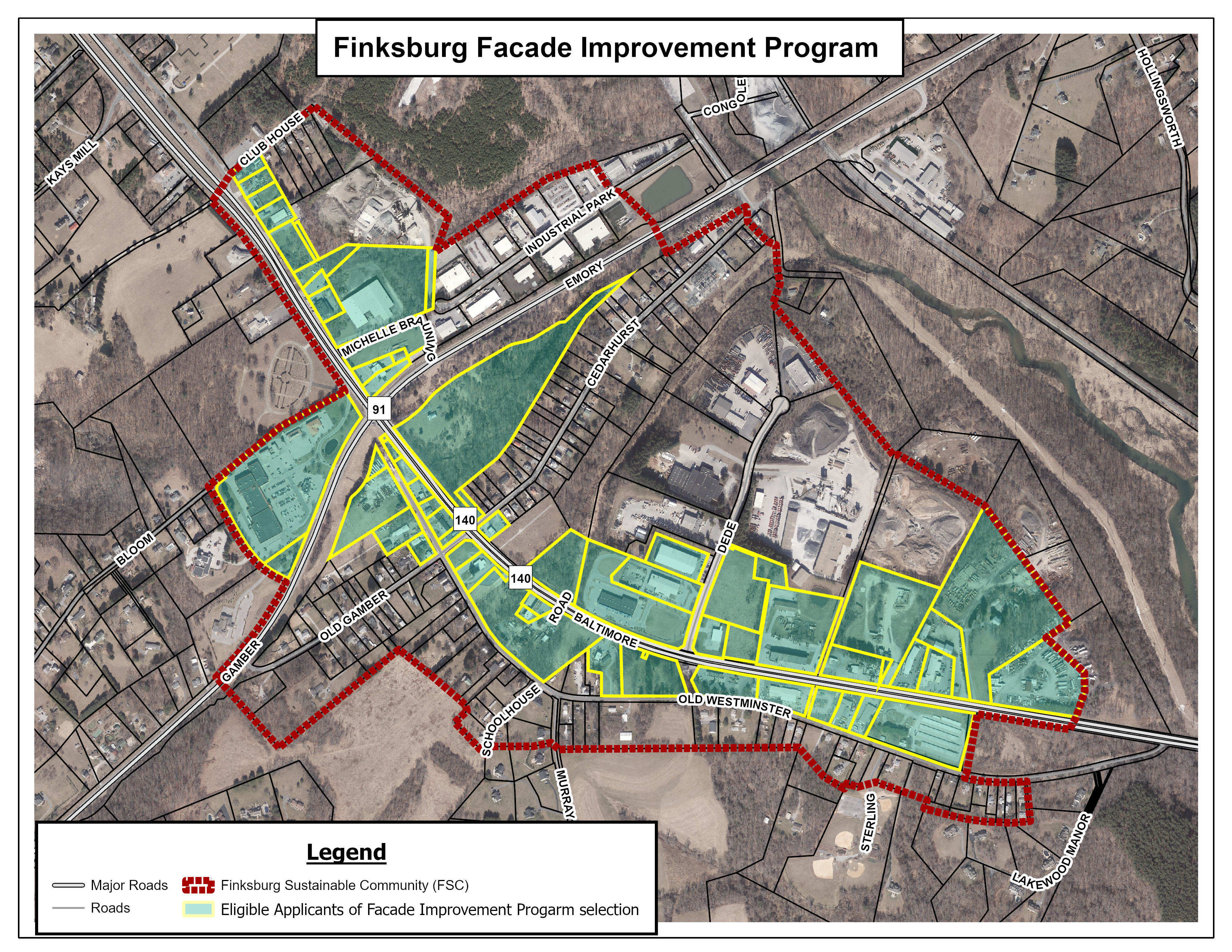 Commercial or industrial zoned properties within the Finksburg Designated Sustainable Community that front MD 140 or are adjacent to a property that fronts MD 140. To determine if your property is eligible, view the Eligible Applicants Map.