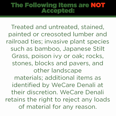 The following items are NOT accepted: Treated and untreated, stained, painted, or creosoted lumber and railroad ties; invasive plant species such as bamboo, Japanese Stilt Grass, poison ivy or oak; rocks, stones, blocks and pavers, and other landscape materials; additional items as identified by WeCare Denali at their discretion. WeCare Denali retains the right to reject any loads of material for any reason.